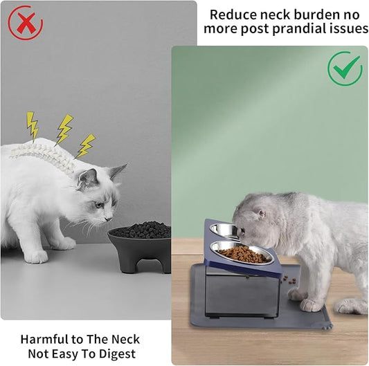 Upgraded Elevated Cat Bowls with Food Mat,15°Tilted Stand Anti Vomiting Raised Cat Dishes for Food and Water,2 Stainless Steel Bowls for Cats and Puppy