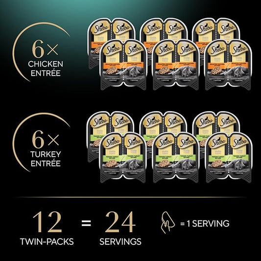 Sheba Perfect Portions Wet Cat Food Cuts in Gravy Variety Pack, Roasted Chicken Entree and Tender Turkey Entree, 2.6 oz. Twin-Pack Trays (12 Count, 24 Servings)