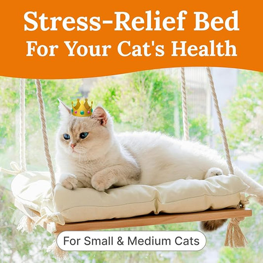 Cat Window Perch - Hammock Bed for Cats Inside - Solid Wood Seat, 4 Strong Suction Cups, Soft Cushion - Rustic Indoor Pet Shelf