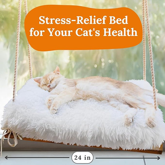 SnugCloud Cat Window Perch with 4-Sided Bolster - Orthopedic Cat Hammock for Window Sill - Solid Hardwood & Metal Frame - Window Seat for Pets (Natural Color Wood w/White Bed, Large)