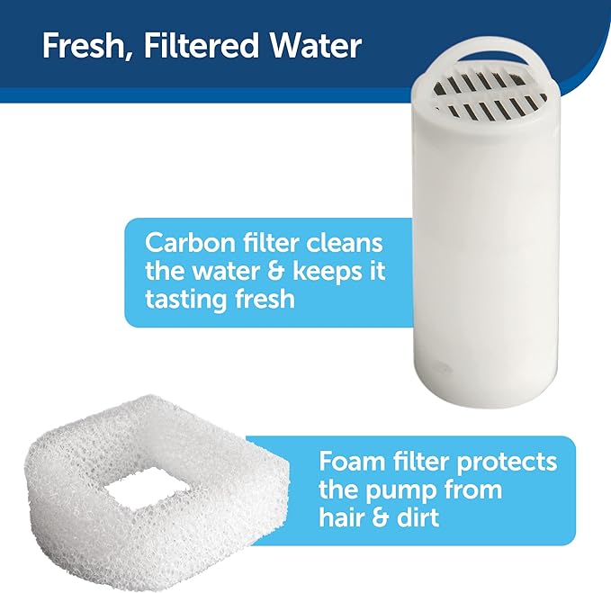 - COMPATIBLE FILTERS AND PUMP: Fountain uses PetSafe Drinkwell Carbon Filter #3 (PAC00-13712), PetSafe Drinkwell Foam Filter 5 (PAC00-13711) and Drinkwell Replacement Pump (PAC00-13206)