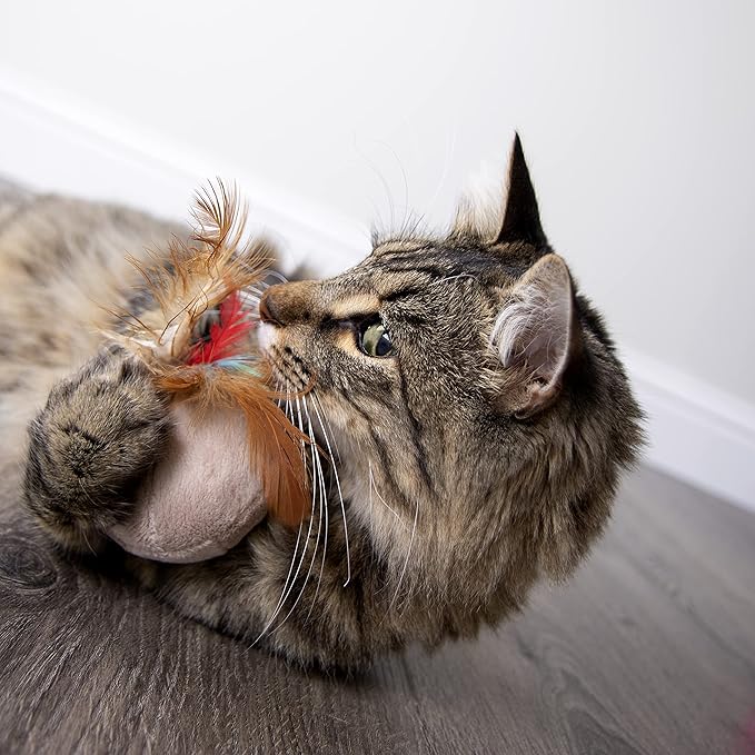 - FEEL OF REAL PREY: The touch-activated cat toy features a soft plush stuffed body and real feathers, mimicking the multitextured feel of real prey to stimulate your kitty's hunting instincts and further entice play