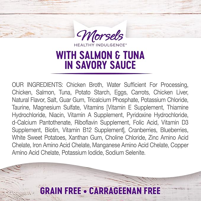 - EASY TO SERVE POUCH: Mess-free pouch makes mealtime easy. This variety features Salmon and Tuna served with a savory, light gravy to satisfy even the most refined palate.