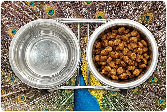 Lunarable Peacock Pet Mat for Food and Water, Peacock Displaying Feathers Vibrant Colors Eye Shaped Patterns Picture, Non-Slip Rubber Mat for Dogs and Cats, 18" X 12", Mustard Brown
