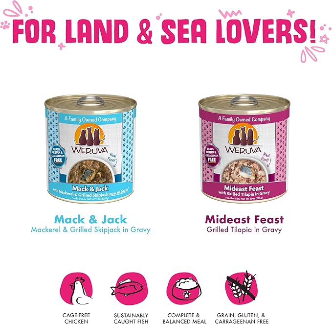- Wowzer Meowzer Variety Pack (10oz cans, Pack of 12) Our 4 most popular poultry and seafood recipes. Weruva’s official variety pack for multi-cat homes!
