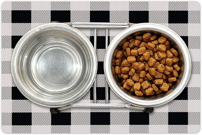 Lunarable Plaid Pet Mat for Food and Water, Monochrome Traditional Lumberjack Pattern Repating Checkered Squares Design, Non-Slip Rubber Mat for Dogs and Cats, 18" X 12", Grey Black