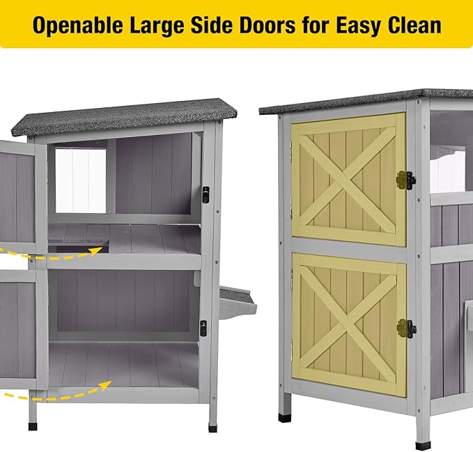 Aivituvin 2-Story Outdoor/Indoor Cat House - Solid Wood Kitty Condo with Escape Door, Removable Floors, Weatherproof Asphalt Roof & Sun Balcony