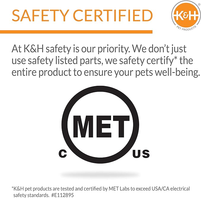 - SAFETY: K&H doesn't just use safety listed parts, we safety certify the entire product. This heated cat bed has been tested & certified by MET Labs and exceeds USA/CA electrical safety standards