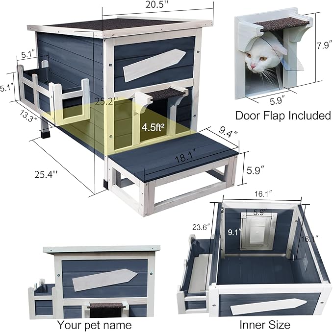- Weatherproof Wooden House: The roof is treated with real asphalt shingles. The emergency opening on the back is covered with acrylic flap door. The front opening is sheltered by asphalt rain stoop