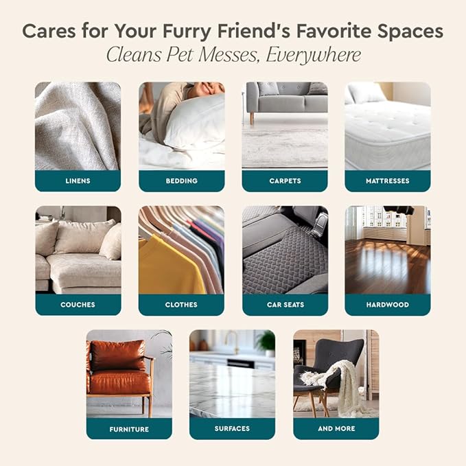 - Freshness for All Pet Spaces - The best cleaner for carpet pet stains extends its cleaning touch to upholstery, bedding, and other fabrics. That's why we formulated our pet urine odor eliminator spray to work on all spaces. From snuggly pet beds to cherished armchairs, it keeps your fur pal's favorite spots comfortably clean.