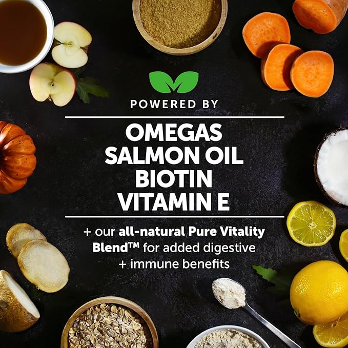 - Built on our exclusive Natural Pure Vitality Blend, Skin Health Omega is formulated with natural ingredients you can find in your own pantry. We combine this nutritious blend with powerful, research-backed active ingredients to best support your dog where they need it most. These easy-to-feed chews promote healthy skin. Plus, your dog will absolutely love the delicious salmon flavor!