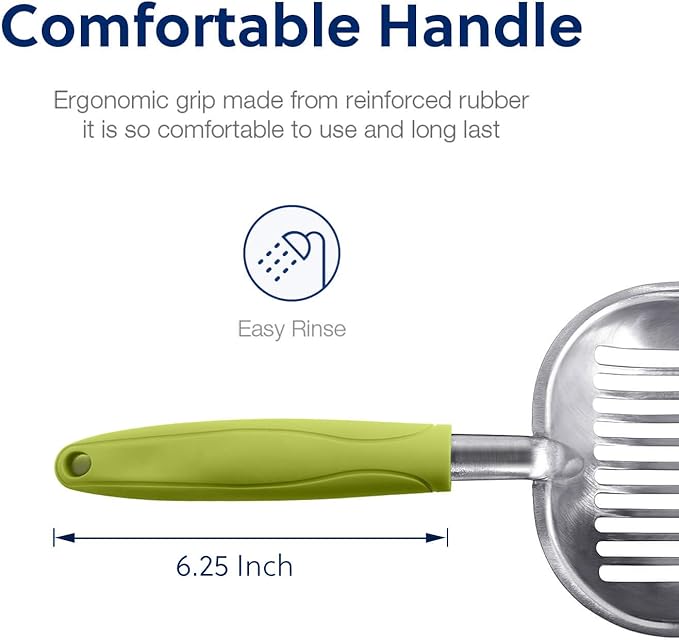 - [Functions]: The sharp edge helps to loosen clumps. The sifter area holds wet clumps and lets clean litter pass through easily. The long handle keeps you away from cat’s waste. It is designed to keep litter box clean and save you loads of cat litter.
