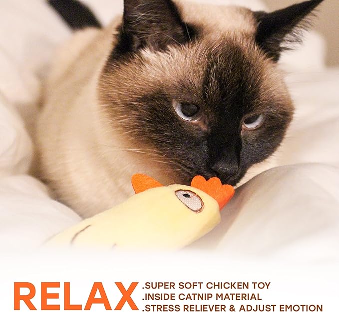 - Eye-Catchy Design - Trigger Your Cat's Natural Instincts! Both the chicken catnip toy and the cat toy wand have a captivating design that will trigger your cat’s natural instincts. Also, combined with the relaxing catnip effect, your beloved pet will be busy living its best life