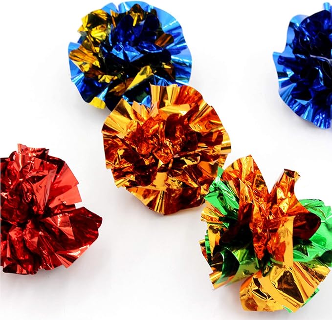 - You will get 30pcs for one pack. Color randomly. There are 10pcs golden thread balls, 10pcs pompoms balls, 5pcs paper balls and 5pcs small footballs. Your cat will have fun with the balls.