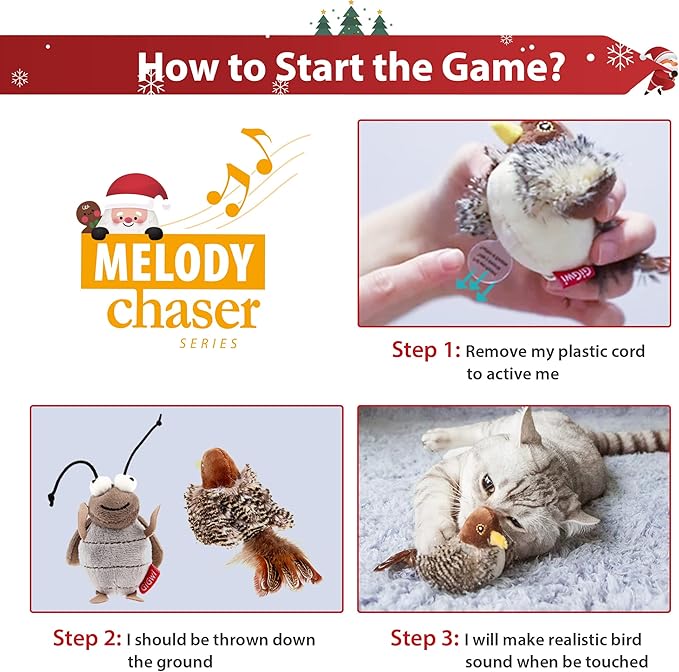 - 【Self Play Cat Toys For Indoor Cats】Every time your feline touches this cat toy, the automatic built-in motion sensor kicks into action and the cat teaser toy chirps like a real bird, intriguing your cat to kick and play. Great pets gift for Birthday, Thanksgiving, Christmas and new year.