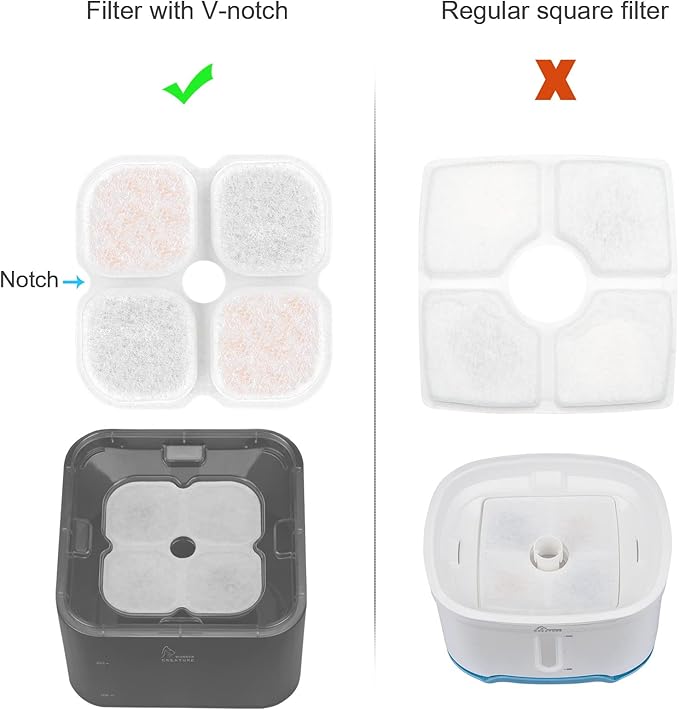 - [Circulating filtration system with 2 stages]: A replaceable charcoal filter removes dirt and food particles, and a pre-filter sponge designed to catch hair and debris. The round filter is composed of cotton layers, coconut shell activated carbons and ion-exchange resins. It provides fresh clean water to your lovely pets.