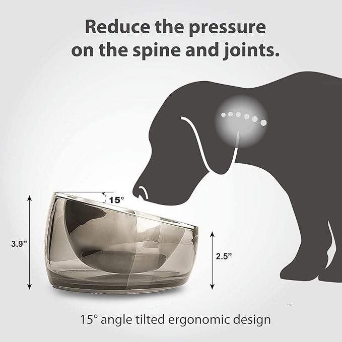 Felli Pet Oblik Spill Proof Dog Food Water Bowl Raised Acrylic Cone, Stainless Steel Tilted Oval Dish Pet Friendly, Slanted Metal Plate Feeder Elevated for Small Medium Size Dog (1.5Cup, Smoky)