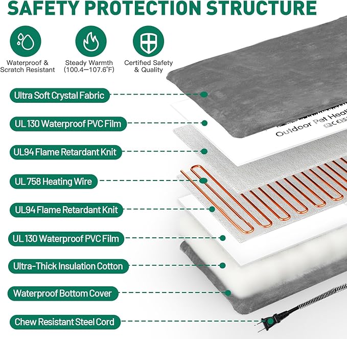 - 🐾ENERGY SAVING & SAFE 🐾 This outdoor heating pad is only 80w, thus it is more energy-savings. Anti-bite power cord design, the extra-long cord extends 5.91 feet with a 4.92 feet steel-encased chew guard. Furthermore, made of fireproof material, so it is really safe for you and your pets.
