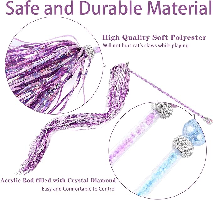 - Unique Design: The Wand Teaser is designed with a long acrylic wand rod filled with crystal rhinestones, a long streamer stassel with a loud jingle bell, and a glamorous crystal beaded crown. The soft shiny tassels are easy to flick and bounce to add enticement, and the acrylic stick handle can help to control more easily and comfortable