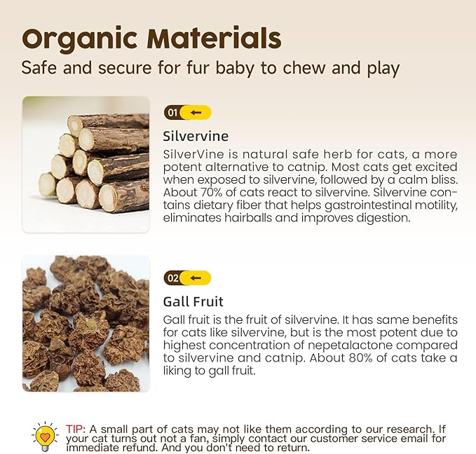 - Guaranteed 100% Natural: Our silvervine sticks are made from 100% natural silvervine sticks, raffia, sisal rope and gall fruit (fruit of silvervine). Please rest assured when giving it to cats because they are absolutely safe for cats to chew and bite