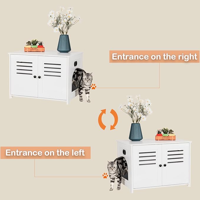 - 【You Decide Cat Entry Direction】For the convenience of you and your cat, we have carefully designed a reversible entrance for the hidden litter box. You can choose to place the opening on the left or right, perfectly blending with any corner of your home. Double cabinet doors with magnets make daily clean and cat care effortless