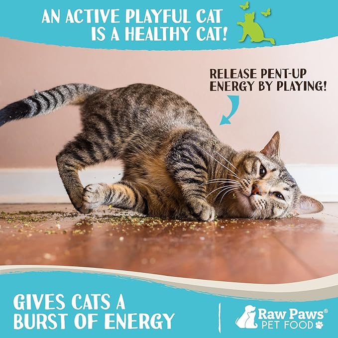 - CRAVED BY CATS: Raw Paws Kitty Catnip both stimulates and relaxes your pet! When kitties inhale our catnip herb for cats, the chemical nepetalactone naturally found in the catnip plant, binds to receptors in their noses. Cats become stimulated and excited, making them playful, active kitty cats. After about 10 minutes, the oil wears off and your kitty needs a nice cat-nap.