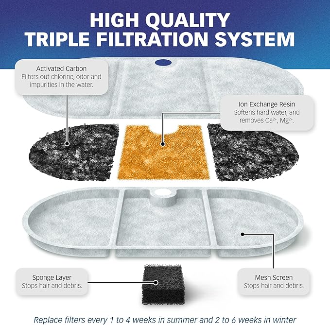 - [Frequency Of Replacement] To prevent the activated carbon dust from shedding into water, please soak the cat fountain filter in water for 5 minutes then rinse thoroughly under running water before using. 1 to 2 weeks in summer and 2 to 4 weeks in winter. If multiple cats are using the fountain, more frequent replacement will be necessary.