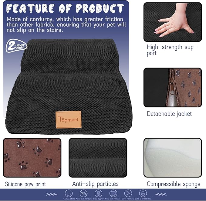 - Safer,Wider&Deeper Steps:Our dog stairs are excellent for those older dogs who are less mobile as they age or for cats with injuries. More wide and deep steps are helpful for reducing the strain that constantly jumping up and down onto lower bed,sofa can have on your pet's joints,and Topmart dog steps will not shake and slip during use. The cover made of corduroy is more frictional than other covers, pets will not slip on the stairs.