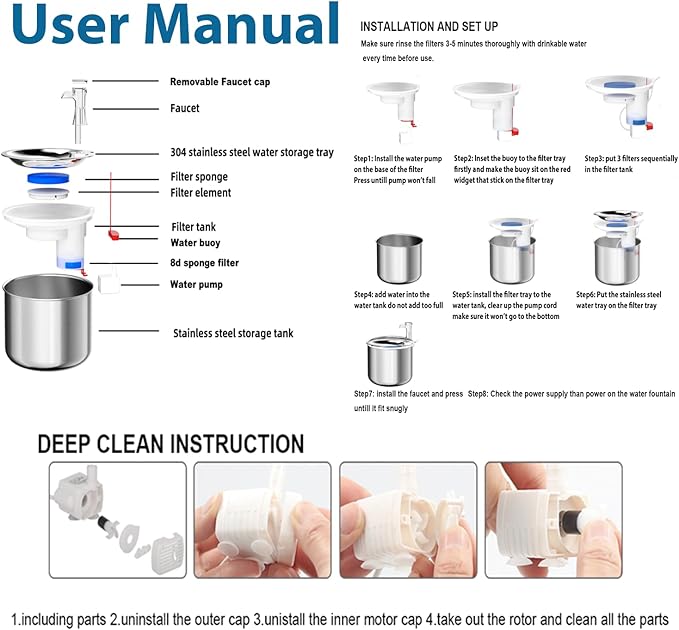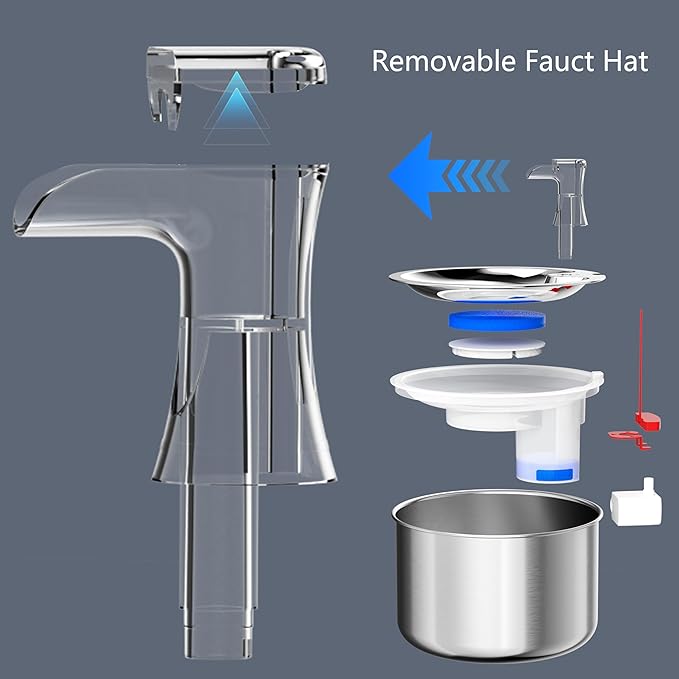 - Triple Filtration Cat Fountains: Water will be filtered by a blue pre-filter sponge firstly, then by an activated carbon filter and a sponge filter with cotton net again. the automatic cat and dog water fountain can provide your pet with pure drinking water, preventing limescale and dirt building up.
