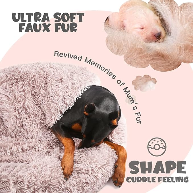 - Calming Dog Bed: Solve pet anxiety and get better sleep and peace of mind. Especially in thunderstorm weather, our pets lack a sense of security and are prone to yelling and anxiety. The plush dog bed in the shape of a donut makes puppies, kittens, and pregnant pets feel embraced, and the blanket adds comfort and alleviates anxiety. It can help your pets stay calm and sleep soundly, even in harsh conditions.