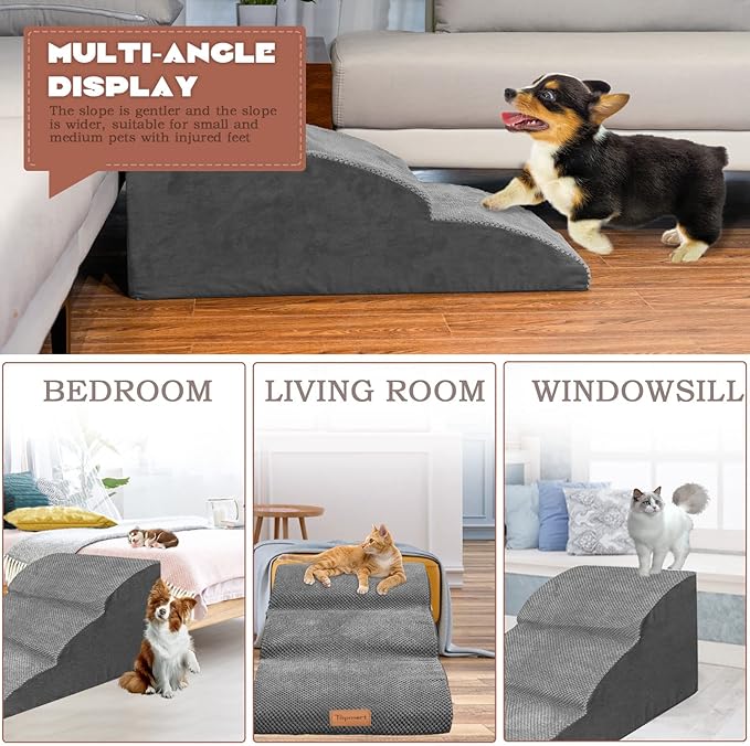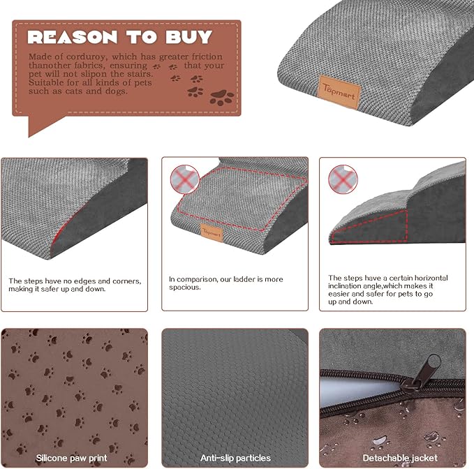 - Safer,Wider&Deeper Steps: Our dog stairs are excellent for those older dogs who are less mobile as they age or for cats with injuries. More wide and deep steps are helpful for reducing the strain that constantly jumping up and down onto lower bed,sofa can have on your pet's joints,and topmart dog steps will not shake and slip during use. The cover made of corduroy is more frictional than other covers, pets will not slip on the stairs.