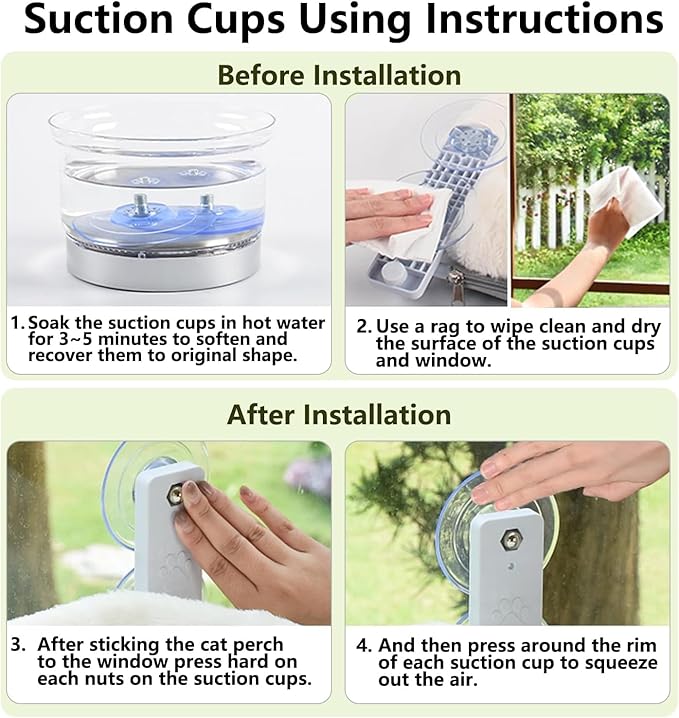 - Strong Suction Cups:AMOSIJOY cat hammock is installed by sticking the suction cups to the glass. It can be firmly mounted on window by 4 suction cups with strong suction power that are enlarged the diameter: 3.3 inches. Besides, a DIY ladder consists of 2~3 hammocks is suitable for cats who love to climb.