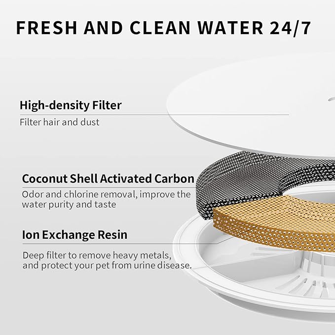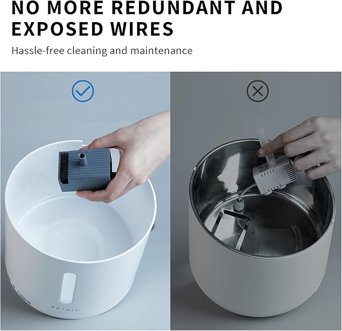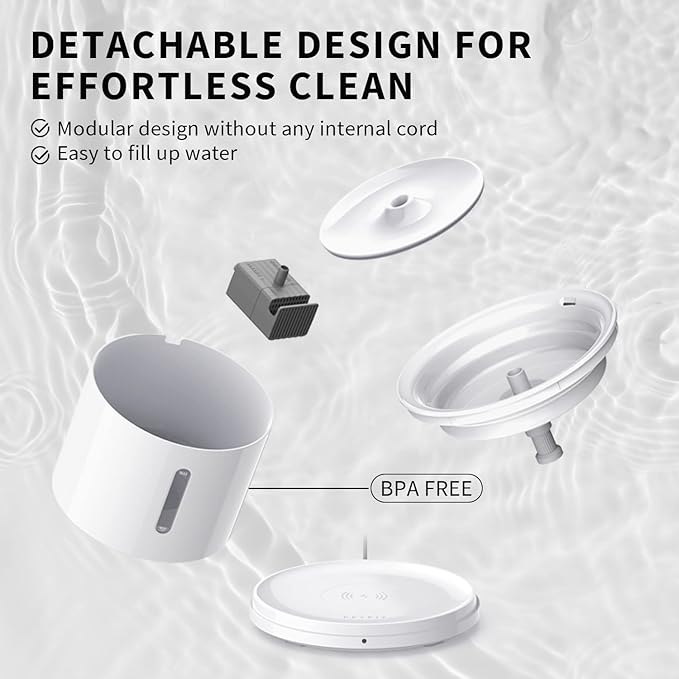 - [Detachable Design] With the detachable water fountain body and base,You won't get the powered base wet when topping up water or cleaning up the fountain.