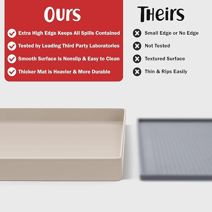 - Less Mess & Less Stress: Super high edge (0.6”) of DogBuddy Dog Food Mat keeps the spilled food and water on the mat and away from your beautiful floor. Silicone is naturally 100% waterproof, so what happens on the mat stays on the mat.