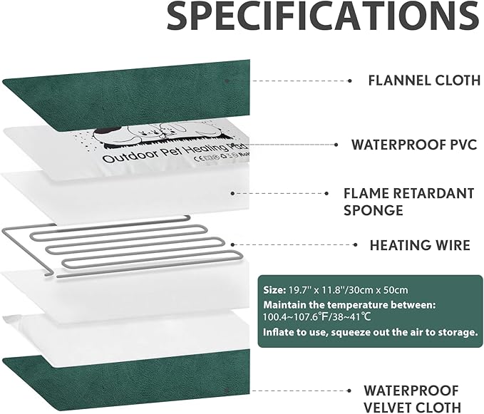 - 🐾ENERGY SAVING & SAFE 🐾 This outdoor heating pad is only 30w, thus it is more energy-savings. Anti-bite power cord design, the extra-long cord extends 5.91 feet with a 4.92 feet steel-encased chew guard. Furthermore, made of fireproof material, so it is really safe for you and your pets.