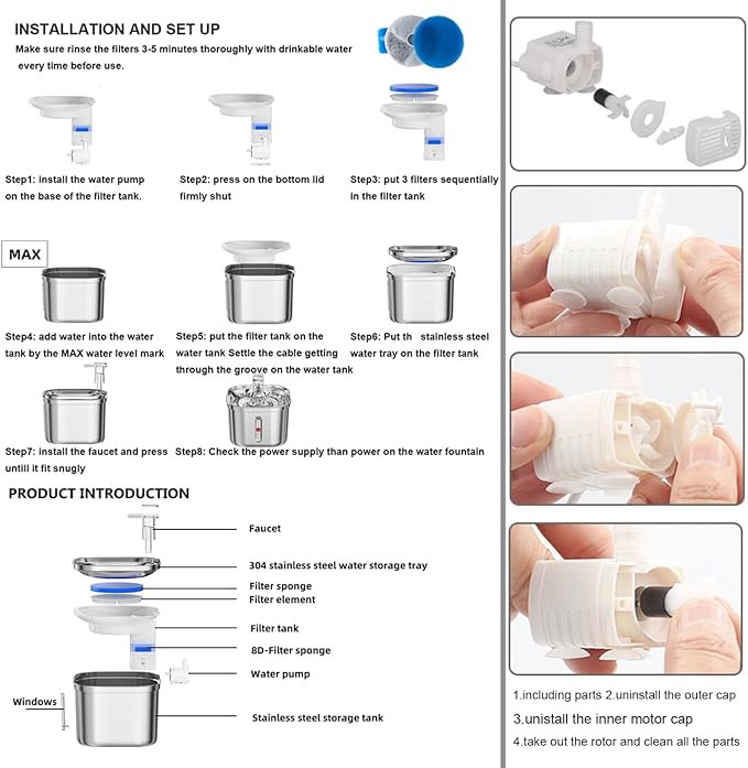 - Triple Filtration Cat Fountains: Water will be filtered by a blue pre-filter sponge firstly, then by an activated carbon filter and a sponge filter with cotton net again. the automatic cat and dog water fountain can provide your pet with pure drinking water, preventing limescale and dirt building up.