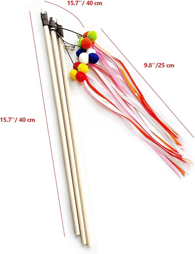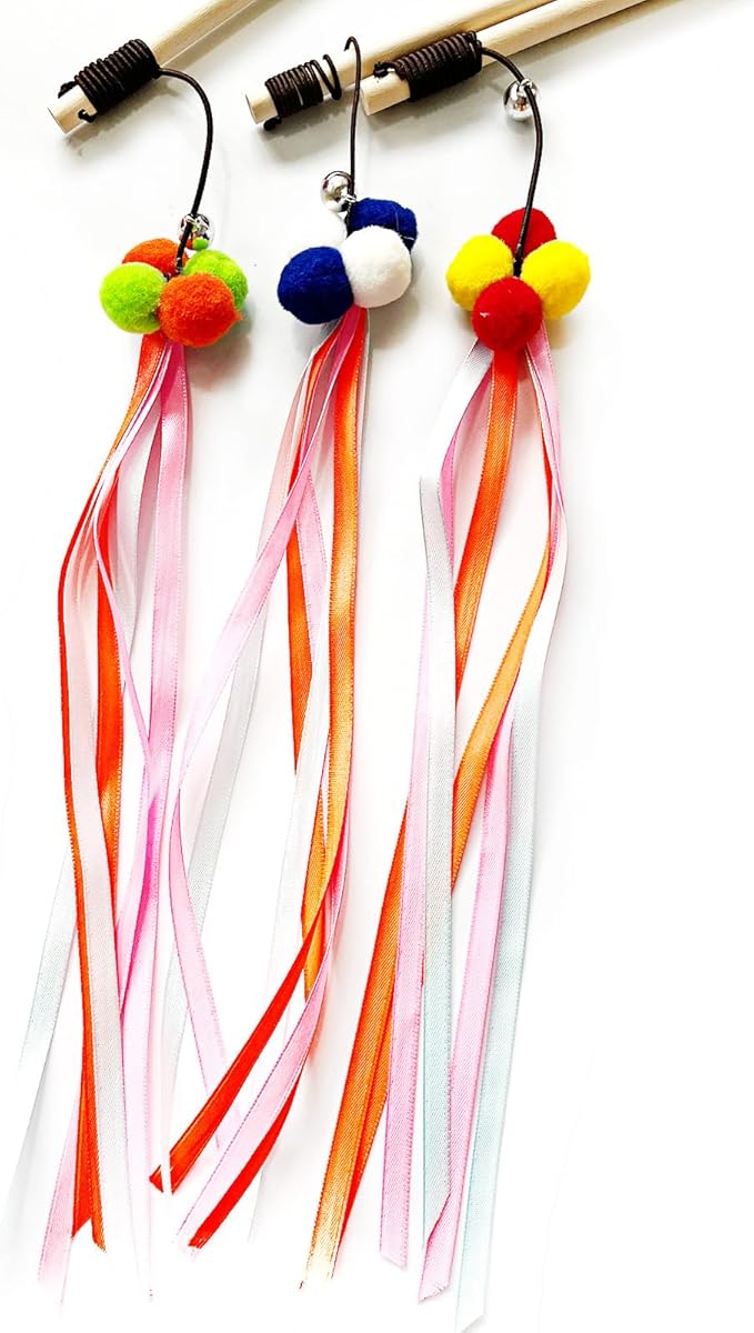 - HAPPY CAT HAPPY OWNER - This cat wand has everything cats love - ribbons, a bell, Pom Poms and a wooden handle