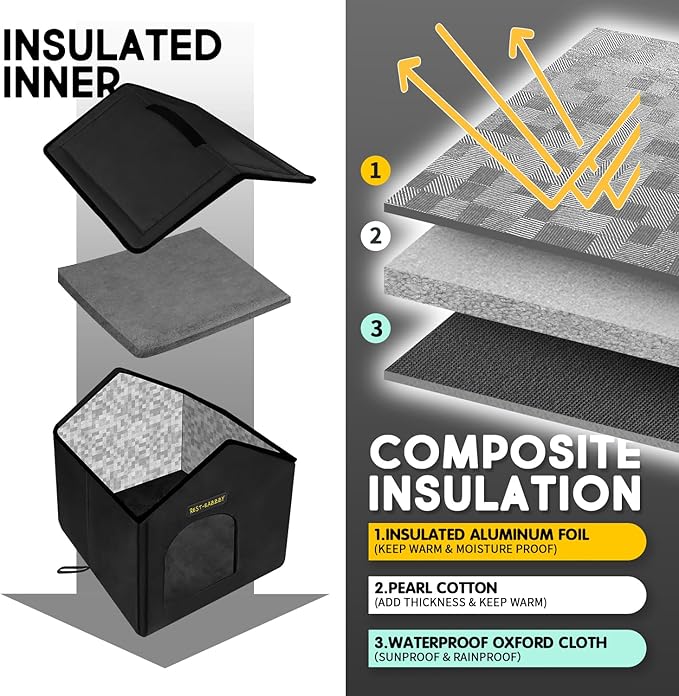 Rest-Eazzzy Cat House for Outdoor Cats, Weatherproof and Insulated Feral Cat House with Mat and Clip, Easy to Put Together, Selfwarming Cat Shelter for Winter, Never Blow Away (Black, House X 2)