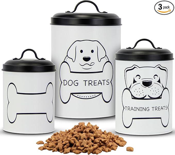 - STYLISH KITCHEN STORAGE: Whether displayed on your kitchen countertop or tucked away in your pantry, these dog treat tins will elevate your space by replacing unsightly packaging. Their black and white design with a matte finish complements various interior décor styles.