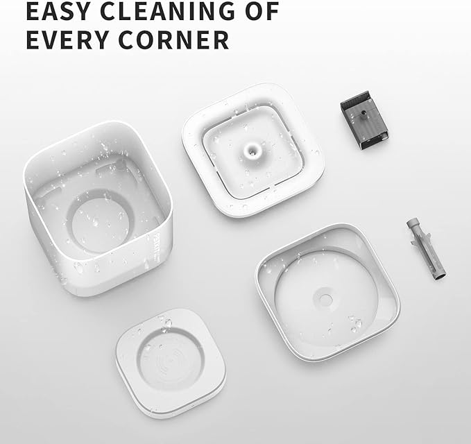 - 3.0 WIRELESS PUMP: This automatic cat water fountain uses upgraded wireless pump 3.0, which is more stable than wired water pump and does not have any wire bundle entanglement, it is more safe. At the same time, a piece of foam filter is placed in water inlet of the pump, which can intercept impurities entering the pump in advance and make the pump have a longer service life. Removable pump structure also makes cleaning easy.
