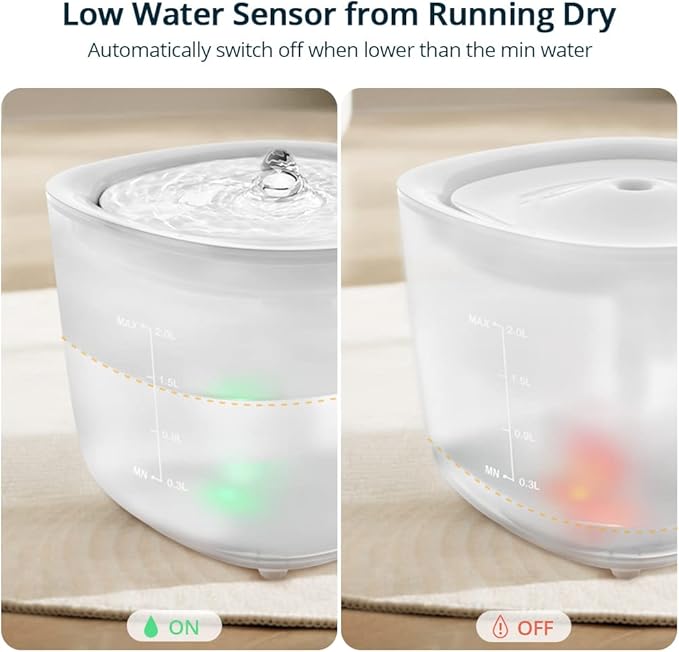 - LED Indicator & 3-Layer Filter: LED light signals when water runs dry, while the coconut shell activated carbon, ion exchange resin, and high-density fiber cotton filter ensure clean and fresh water for your pets.