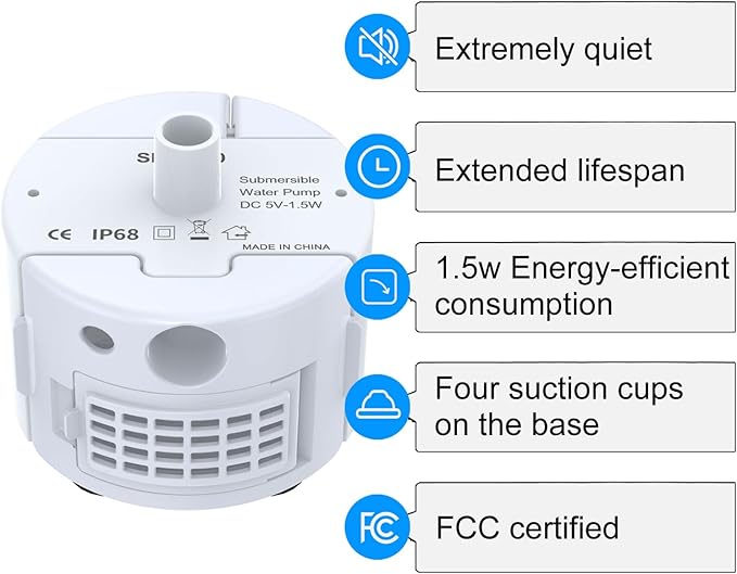 - [Ultra-Quiet Pump (<30dB)]: With its ultra-quiet operation below 30dB, the pump is perfect for quiet environments and nighttime use; Made of BPA-free material and sealed with resin for easy cleaning and corrosion resistance, it ensures durability; The pump operates efficiently with a low power consumption of 1.5W, maintaining optimal performance