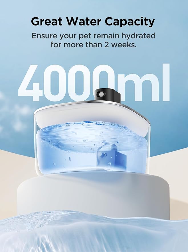 - Stay Hydrated All Days: 4 L water capacity provides enough water for multiple pets to drink from and you don't have to worry that the water will run out when you're away from home. 210ml wide water tray still allow your furkid to be well hydrated when out of power. The drinking fountain is stable enough that your naughty cats never knock it over