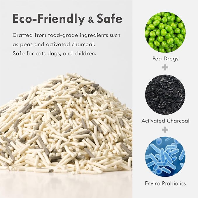 - 100% Food-grade Ingredients: Crafted from premium pea fiber and starch, our litter is an embodiment of our commitment to your pet's well-being and the environment. Trust in a cat litter made entirely from natural ingredients.