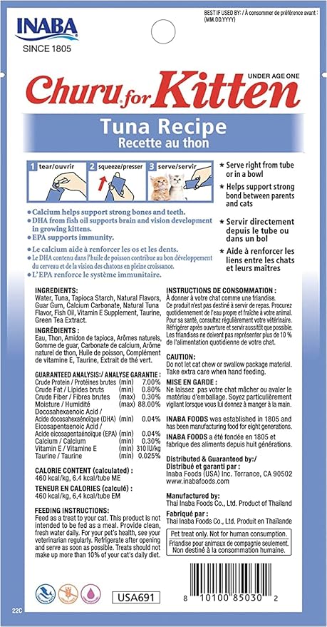 INABA Churu for Kittens, Grain-Free Creamy, Purée Lickable Cat Treats with DHA, EPA, Vitamin E & Taurine, 0.5 Ounces Each, 12 Tubes (4 per Pack), Tuna Recipe