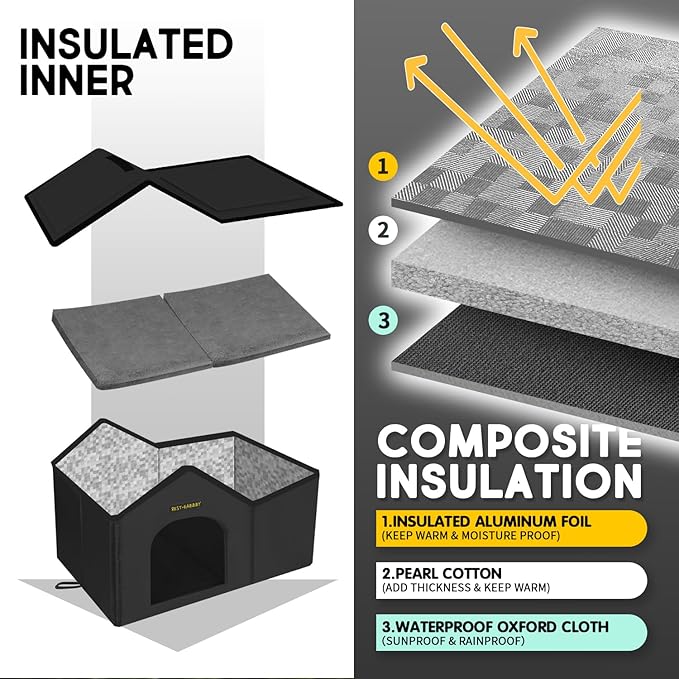 Rest-Eazzzy Cat House for Outdoor Cats, Weatherproof and Insulated Feral Cat House with Mat and Clip, Easy to Put Together, Selfwarming Cat Shelter for Winter (Black, Waterproof House-L)