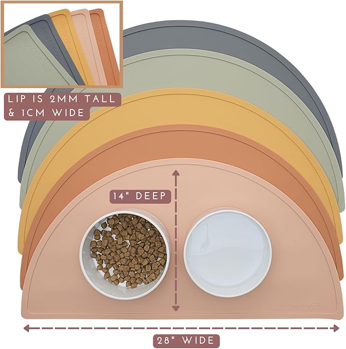- CONTROL SPILLS AND MESSES: Our silicone pet food mat with a raised edge helps keep spills and messes on the mat. The large size mat is 28" across x 14" deep. It works with bowls that are 10" across or smaller. The lip is .2" tall and .4" wide.