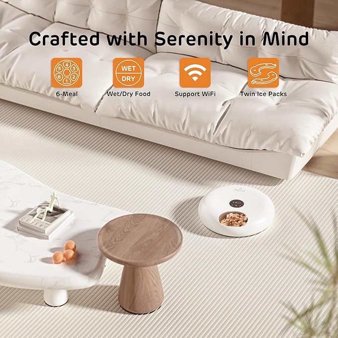 - WiFi App Control: Use the smart control app to feed your pets anytime, anywhere. Schedule up to 6 meals a day or customize it for 2 meals a day for 3 days, or 1 meal a day for up to 6 days. Track feeding records and share the device with multiple accounts (2.4GHz network only).