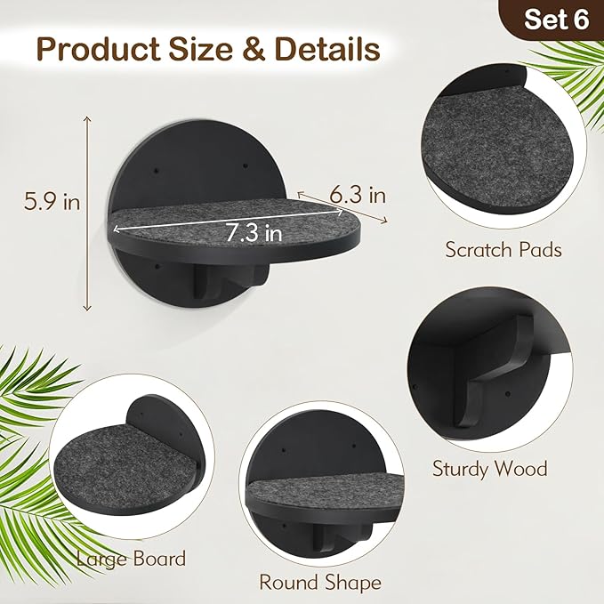 - 【Great Partner to All Cat Shelves】The cat wall shelves consist of 6 cat steps with scratching pad on it. With updated frame, the cat wall steps can be installed on the wall more stably to secure your cats. Board area is large enough for your kitten to jump, rest and play on. The simple and stylish appearance not only allows the cat climbing shelves to be used on its own, but also can be used with any other cat wall furniture, making the most of them.