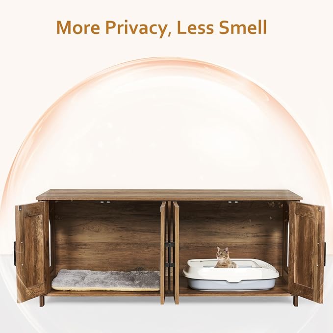 - Thoughtful design: Each side of our cat litter box furniture comes with a cat hole, allowing your cats to come in and out more freely,Double cabinet doors allow you to scoop the litter daily and store cat food more conveniently.water-resistant veneered surface make cleaning a breeze
